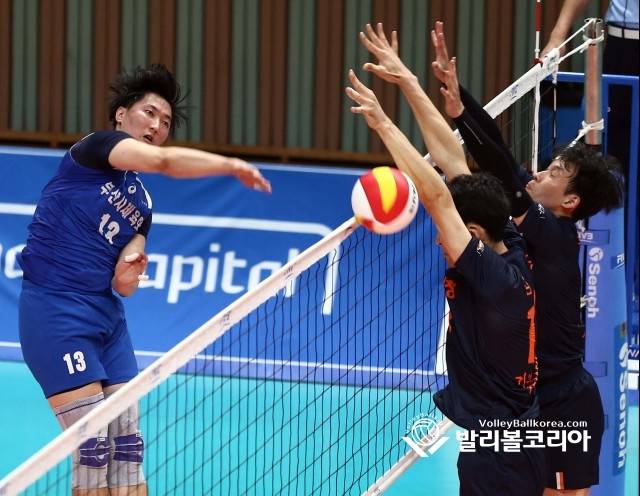 6일(금) 강원도 홍천군 홍천종합체육관에서 열린 2019 한국실업배구연맹회장배 종합선수권대회 남자부 예선 화성시청 vs 부산시체육회 경기에서 부산시체육회 정영호의 공격을 화성시청 김은우와 이정준이 블로킹하고 있다.