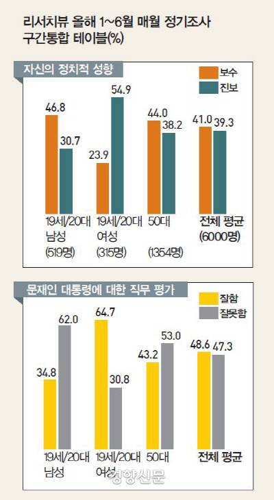 19세·20대 여성은 20대 남성과 정치적 성향이 전혀 달랐다. 19세·20대 여성(6개월 합계 315명)은 보수성향이 23.9%, 진보성향이 54.9%였다. 전 연령대에 걸쳐 가장 진보 성향이 많았다. 20대의 부모 세대인 50대(6개월 합계 1354명)에서는 보수가 44.0%, 진보가 38.2%였다. 안 대표는 “지난해 동계올림픽에서 여자아이스하키 남북단일팀 논란이 일 때부터 20대 남성의 생각이 20대 여성과 다른 결을 보이면서 여론조사에서도 20대의 경우 남성과 여성을 세분화해서 들여다보고 있다”고 설명했다.