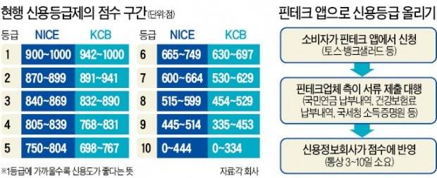 점수제에서는 CB사가 개인 신용을 1~1000점 사이의 점수로만 평가해야 한다. 금융회사는 제공받은 점수를 토대로 자체적인 신용위험 평가를 한다. 금융위 관계자는 “등급 간 문턱이 사라지고 신용평가가 한층 정교해질 것”이라며 “7등급 상위에 몰려 있는 약 240만 명이 제도권 금융회사를 이용함으로써 연 1%포인트 안팎의 금리 인하 효과도 누릴 수 있다”고 설명했다.