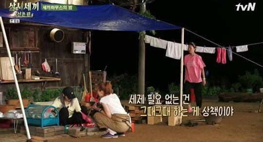 ‘산촌편’은 여자라서 가능한 이야기를 보여주는데 초점을 맞추지 않는다. 오히려 남자들보다 더 힘을 쓰고, 자신의 매력을 어필하는 데는 신경을 덜 쓴다. 꾸밈이 없다. 화제가 될 만한 레시피를 준비해오기보다 작업 동선을 편하게 하기 위한 구조변경 안을 고민해오는 식이다. 세수도 안 하고 카메라에 서기도 할 정도로 편안한 차림은 망가짐이 아니라 자연스러움의 영역이다.