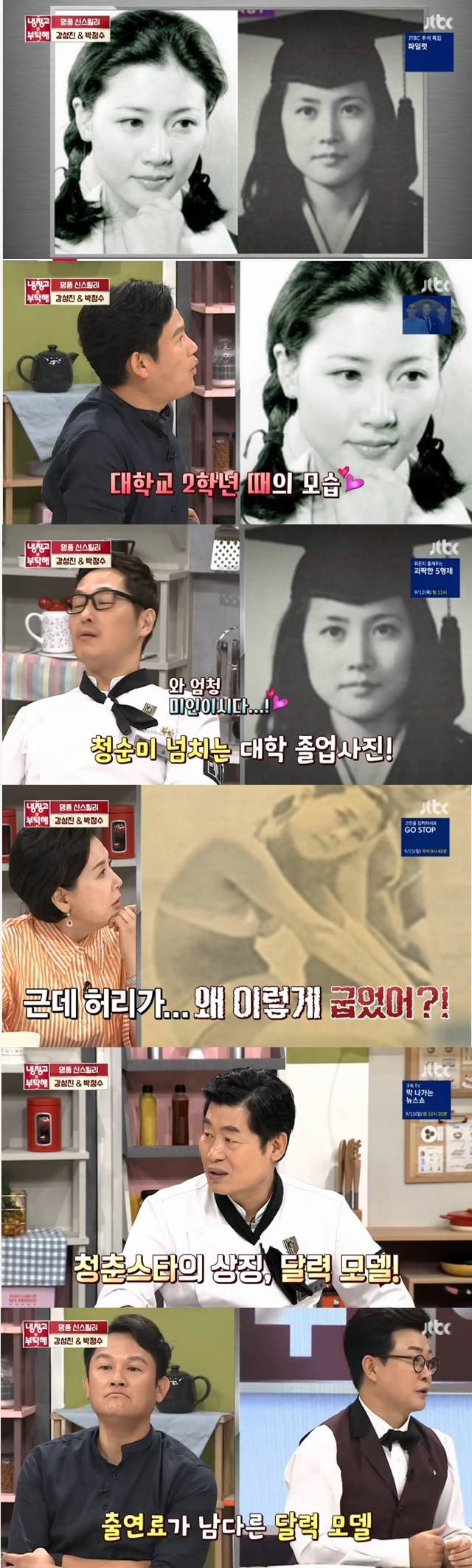 이날 MC들은 박정수의 리즈 시절 사진을 공개했다. 박정수는 “왼쪽 사진은 대학교 2학년 당시 MBC에서 첫 드라마 주연을 맡았을 때고, 오른쪽 사진은 대학교 졸업할 때 사진이다”라고 밝혔다. 또 박정수의 여드름 CF광고도 공개됐다. MC들이 파격적인 수영복 패션을 언급하자 박정수는 겸연쩍은 듯 “등이 왜 저렇게 굽었지”라며 부끄러워했다.