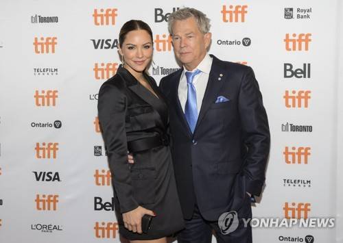 Katharine McPhee, left, and David Foster arrive for the premiere of the film "David Foster: Off The Record" at the 2019 Toronto International Film Festival in Toronto, Monday, Sept. 9, 2019. (Andrew Lahodynskyj/The Canadian Press via AP)