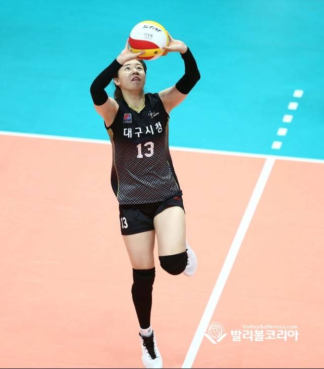 【발리볼코리아닷컴(홍천)=김경수 기자】 10일(화) 강원도 홍천군 홍천종합체육관에서 열린 2019 한국실업배구연맹회장배 종합선수권대회 여자부 4강전 양산시청 vs 대구시청 경기에서 대구시청 세터 이윤주가 공격하기 위해 토스를 하고 있다.