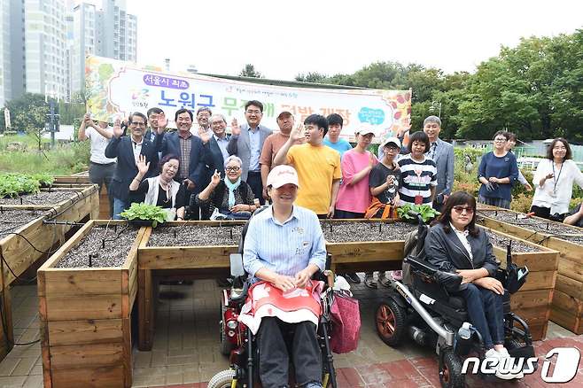 10일 오전 서울 노원구 에코센터에서 열린 ‘서울시 최초 노원구 무장애 텃밭 개장식’에서 오승록 노원구청장 등 참석자들이 기념촬영을 하고 있다. 서울시 최초로 장애인들을 배려해 하단 사선 설계 등을 하는 등 맞춤 제작한 텃밭상자 12개, 휠체어를 이용하는 장애인들의 보행권 확보를 위한 바닥 보도블록 시공, 텃밭에 물주기가 힘든 장애인들을 위해 시간 설정해 자동으로 물을 뿌려주는 점적관수장치 등을 조성해 마련됐다. (노원구청 제공) 2019.9.10/뉴스1