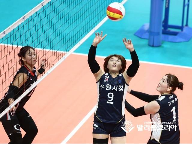 10일(화) 강원도 홍천군 홍천종합체육관에서 열린 2019 한국실업배구연맹회장배 종합선수권대회 여자부 4강전 포항시체육회 vs 수원시청 경기에서 수원시청 여달샘이 공격하기 위해 토스를 하고 있다.