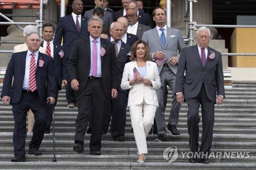 epa07835224 Speaker of the House Democrat Nancy Pelosi (Front 2-R) and House Majority Leader Democrat Steny Hoyer (Front R), with House Minority Leader Republican Kevin McCarthy (Front 2-L) and Republican Representative from Louisiana Steve Scalise (L); walk out with members of the US House of Representatives shortly before observing a moment of silence to commemorate the 18th anniversary of the 9/11 terrorist attacks, at the House East Front steps on Capitol Hill in Washington, DC, USA, 11 September 2019. EPA/MICHAEL REYNOLDS