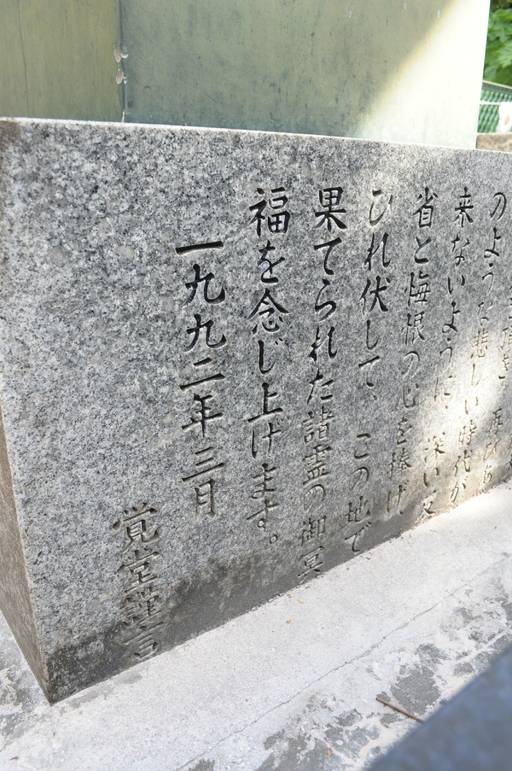 “인류는 평등하며 차별은 모든 악의 근원이다. 무명을 끊고서 넓은 지혜를 받들어, 다시금 이러한 슬픈 시대가 오지 않도록 깊은 반성과 회한의 마음을 바치며, 엎드려 이 땅에서 저물어간 여러 영혼의 명복을 빈다. 1992년 3월.”