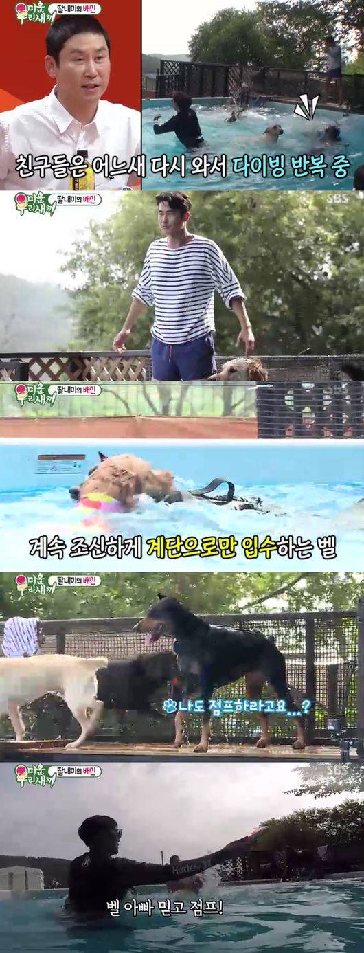 배정남은 계단으로만 입수하는 벨을 보며, 직접 웃통을 벗고 점프를 시도했다. 하지만 벨은 배정남 시범에도 쉽사리 점프를 못 했다. 배정남은 "아빠 믿고 점프"라고 외쳤고, 마침내 벨이 점프에 성공했다. 대견한 벨의 모습이 모두를 대견하게 했다. 배정남은 반려견 벨과 함께 시간가는 줄 모르고 시원한 물놀이를 즐겼다.