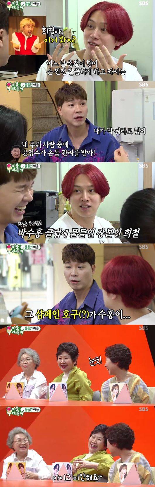 손톱관리 중독까지 됐다는 김희철보며 박수홍은 "그래서 얼굴이 여자처럼 되는 것"이라 말해 웃음을 안겼다. 그러면서도 "신문물을 알려준다"고 하자, 김희철은 "사실 수홍형 클럽 처음 가르쳐줬다"고 해 박수홍母가 충격을 받았고, 김희철 母는 미안함에 어쩔줄 몰라했다. 사이에 있던 김종국母는 "즐겁게 해줬는데 뭐가 미안하냐"고 말해 웃음을 안겼다.