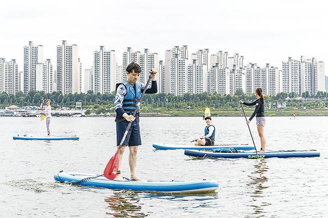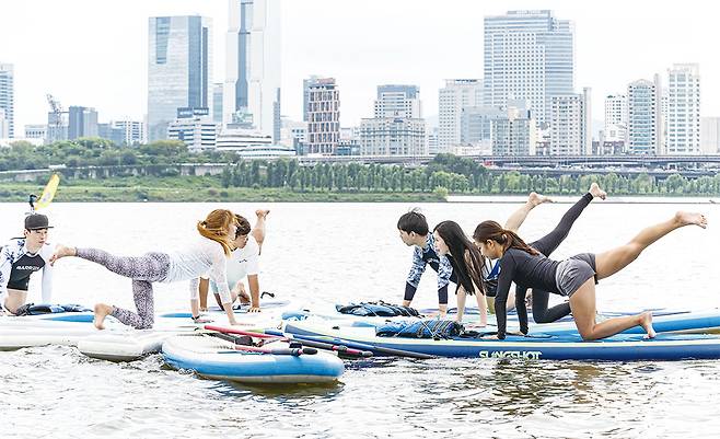 요가 수업이 시작된다. “요가는 호흡과 명상의 운동”이라는 최 강사의 차분한 목소리를 따라 그가 시키는 대로 동작을 취하면 된다. 손바닥을 하늘로 향한 채 무릎 위에 힘을 빼고 올려둔다. 눈을 감고 호흡을 느낀다. 강바람이 얼굴을 살랑이고 물방울이 참방거린다. 옆에서 패들보드를 즐기는 아이들 웃음소리, 멀리서 제트보트가 내는 엔진소리도 들려온다. 최 강사는 “우리는 모두 어머니 배 속 양수 안에 있었다. 지금은 기억나지 않지만 그때의 편안하고 아늑한 느낌을 떠올려보자”고 말했다.