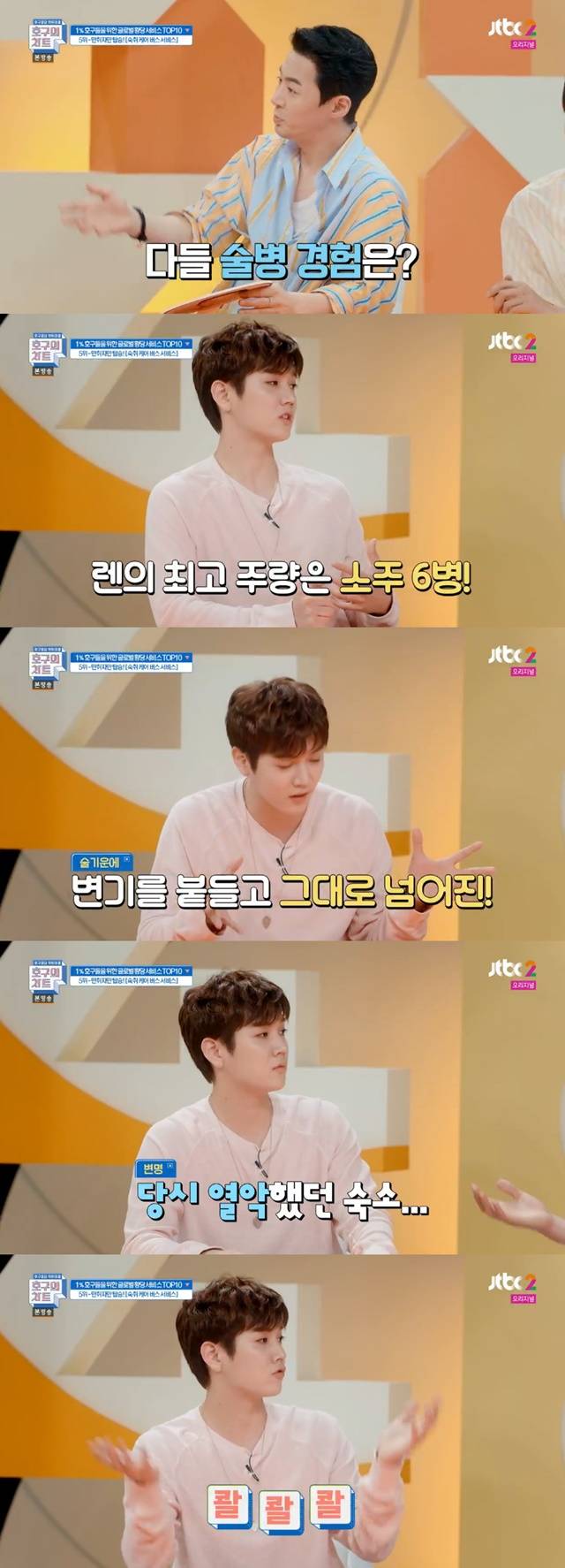 이어 렌은 "술기운에 변기를 붙들고 넘어졌는데 그때 숙소가 열악했다. 그래서 물이 콸콸 흐르고 난리 났던 기억이 있다"고 덧붙였다.(사진=JTBC2 '호구의 차트' 캡처)