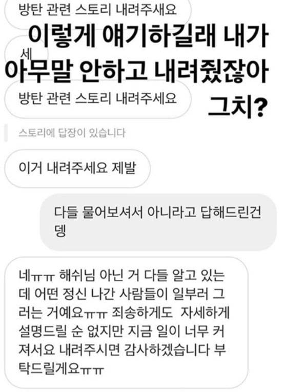 일부 네티즌들은 "방금 올린 스토리 제발 내려주세요. 방탄 관련 스토리 내려주세요"라고 DM을 보냈고 해쉬 스완은 "이렇게 얘기하길래 내가 아무말 안하고 내려줬잖아 그치"라는 글을 남겼다.