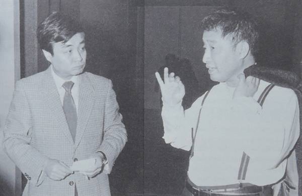 | ▲ 1987년 백남준과 김원 건축가가 다다익선 설계방식에 대해 논의하는 모습 |