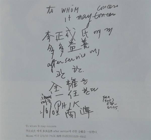 | 2003년 2월 6일 백남준, 이정성씨에게 보낸 팩스 다다익선 수리전권을 위임하다 |
