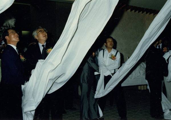 | ▲ 1988년 9월 15일 다다익선 작품 제막식 사진. 당시 이경성 국립현대미술관 관장(왼쪽)과 백남준 |
