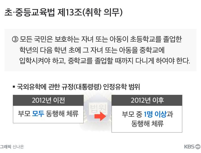 초중등교육법에 따르면 모든 국민은 보호하는 자녀나 아동을 초등학교에 입학시켜야 하고, 초등학교와 중학교를 졸업할 때까지 다녀야 한다고 규정해 초등학교와 중학교가 의무교육 대상인 점을 명확히 하고 있습니다. 이에 따라 국외유학과 관련한 규정을 담은「국외유학에 관한 규정(대통령령)」에서는 자비유학 자격을 '중학교 졸업 이상의 학력이 있거나 이와 동등 이상의 학력이 있다고 인정되는 자'로 명확히 해, 초·중학교 재학생의 유학을 원칙적으로 금지하고 있습니다.