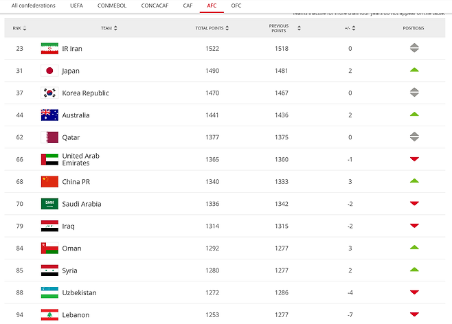 아시아권에서는 이란이 23위, 일본이 31위로 한국보다 앞섰고, 호주는 44위에 올랐다.