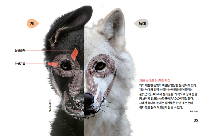 그 결과 개는 늑대와 달리 눈썹과 눈꺼풀을 들어올리는 눈윗근육(LAOM·눈꼬리올림근)이 발달했다는 사실을 알아냈다. 또 ‘늑대개’라는 별명을 가진 시베리안허스키를 제외하고 모든 개에게서 눈꺼풀을 귀 쪽으로 당겨서 눈을 크게 보이게 만드는 눈옆근육(RAOL·눈옆꼬리수축근)이 발달해 있었다.