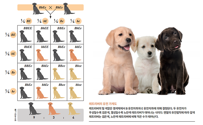 레트리버의 털 색깔은 염색체에서 B 유전자좌와 E 유전자좌가 결정한다. 두 유전자가 우성일수록 검은색, 열성일수록 노란색 레트리버가 태어난다. 멘델의 유전법칙에 따라 비율을 매기면 갈색 레트리버는 상대적으로 적은 수가 태어나고, 계속해서 갈색 품종을 유지하기 위해 좁은 범위에서 교배가 이뤄진다.