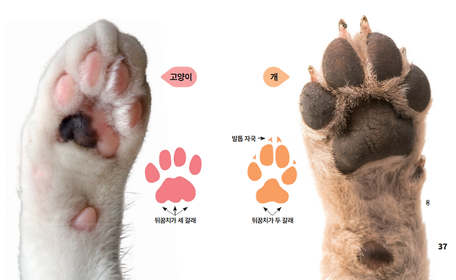 고양이의 발은 개와 유사하지만 몇 가지 다른 특징이 있다. 먼저 필요할 때 발톱을 감출 수 있는 ‘접이식’ 구조다. 이는 호랑이나 사자 같은 고양잇과 동물에서 공통적으로 나타나는 특징이다. 따라서 개와 고양이는 발자국만 보고도 구분할 수 있다. 발가락 자국 위에 발톱자국까지 있으면 개 발자국이고, 그렇지 않으면 고양이 발자국이다.