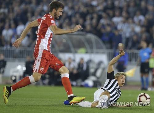 epa07862010 Partizan?s Takuma Asano (R) in action against Red Star?s Nemanja Milunovic (L) during the Serbian SuperLiga soccer match between Partizan and Red Star in Belgrade, Serbia, 22 September 2019. EPA/ANDREJ CUKIC