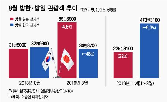 23일 한국관광공사와 일본정부관광국(JNTO)이 각각 발표한 8월 외국인 방문객 통계에 따르면 방일 한국인관광객 수는 30만8700명으로 전년 동월 대비 48% 감소했지만, 방한 일본인관광객 수는 32만9652명으로 4.6% 증가했다. 최근 수년 간 오는 일본인보다 가는 한국인이 많았던 양국 관광교류 규모가 역전됐다.