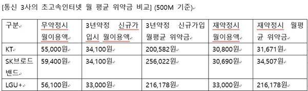 예를 들어 KT와 SKB의 500메가 초고속 인터넷 3년 약정 상품(월 5만5,000원, 5만9,400원)의 경우 신규 가입자는 월 평균 위약금이 KT 20만582원, SKB 25만6,022원이지만 재약정 가입자의 월 평균 위약금은 KT 3만1,671원, SKB 3만4,507원으로 대폭 떨어진다. 반면 LG유플러스는 같은 상품(월 5만6,100원)의 월 평균 위약금이 신규나 재약정 구분없이 모두 21만6,178원이다. 즉 장기 가입자에게 위약금 할인을 해주지 않는다.