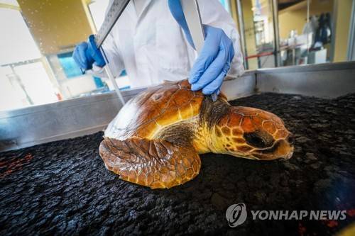 epa07866027 The sea turtle nicknamed Greta found by a fisherman in Gaeta, wrapped in a tangle of lines and with a hook ingested, in Naples, 24 September 2019. Greta underwent a surgery in the Research Center of the Zoological Station of Naples 'Anton Dohrn'. EPA/CESARE ABBATE