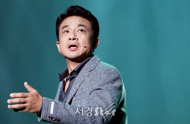 배우 이정열이 24일 서울 용산구 한남동 블루스퀘어 아이마켓홀에서 열린 2019 육군 창작 뮤지컬 '귀환' 프레스콜에서 하이라이트 장면을 시연하고 있다.