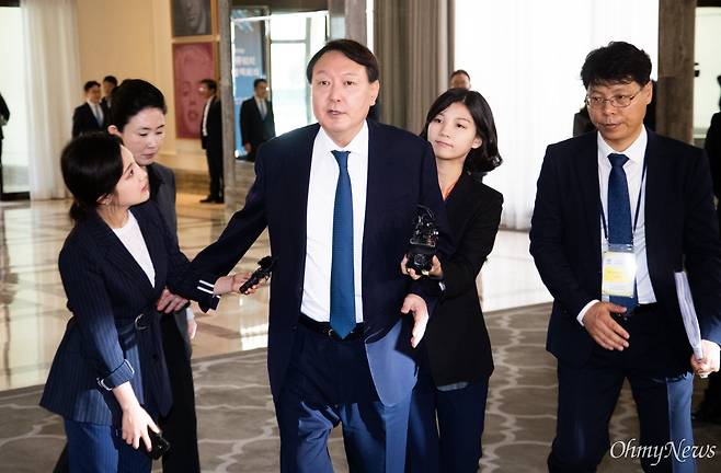 하지만 오전 11시 14분, 호텔 로비에 도착한 윤 총장은 "오늘은 마약류퇴치국제협력회의고, 외국 손님들도 많이 오셨으니까 (행사에) 많은 관심을 부탁드린다"고 했다. 이어 "(조국 장관 관련) 수사는 절차에 따라 진행되고 있다"고 짧게 덧붙였다. 취재진은 '헌법정신에 입각한 수사라던 기존 생각에 변함이 없냐'고 물었지만, 질문을 채 듣기도 전에 윤 총장은 행사장 안으로 들어갔다.