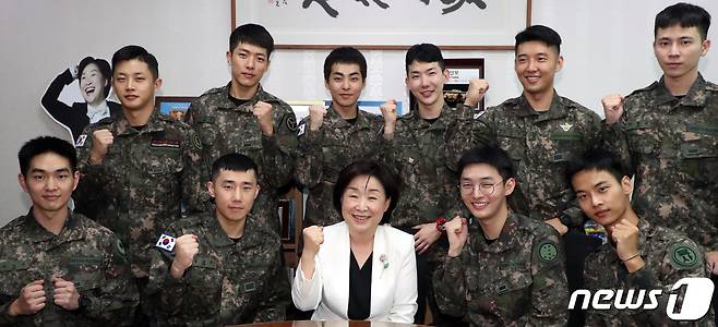 (서울=뉴스1) 김명섭 기자 = 심상정 정의당 대표와 육군 창작뮤지컬 '귀환' 출연진인 샤이니 온유와 EXO 시우민 2AM 조권 등이 25일 오후 서울 여의도 국회의원회관에서 면담을 마치고 파이팅을 외치고 있다. 2019.9.25/뉴스1