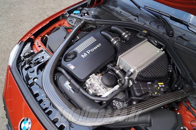 큰 차이 느끼기 힘든 외관과 평범함 실내의 아쉬움은 가속 페달 한 번만 밟으면 모두 사라진다. M2 컴페티션은 직렬 6기통 3.0ℓ 엔진은 그대로지만 기존 M2에 들어가던 싱글 트윈스크롤 터보 방식(N55 타입)을 버리고 M3 및 M4 에 탑재된 트윈터보 방식(S55 타입) 엔진을 넣었다. 작은 차체에 형이 쓰던 심장을 물려받은 결과 최고출력 410마력, 최대토크는 56.1㎏·m를 뿜어낸다. 일반 M2와 비교해 무게는 살짝 올라갔지만 40마력 높고 8.7㎏·m 더 강한 수치다. 0→100㎞/h 가속은 4.2초, 최고시속은 250㎞에서 제한된다.