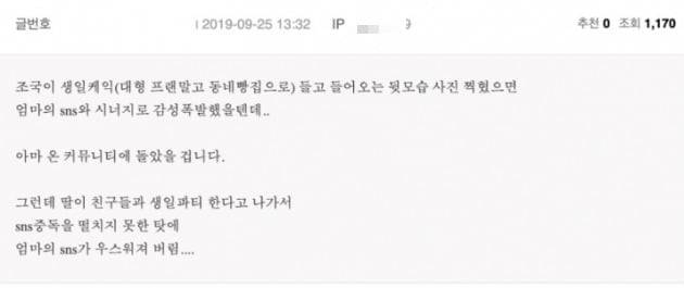 "조국이 생일케잌 들고 들어오는 뒷모습 사진 찍혔으면 엄마의 SNS와 시너지로 감성폭발했을텐데...아마 온 커뮤니티에 돌았을 것이다. 그런데 딸이 친구들과 생일파티 한다고 나가서 SNS 중독을 떨치지 못한 탓에 엄마의 SNS가 우스워져 버렸다"는 내용이었다.