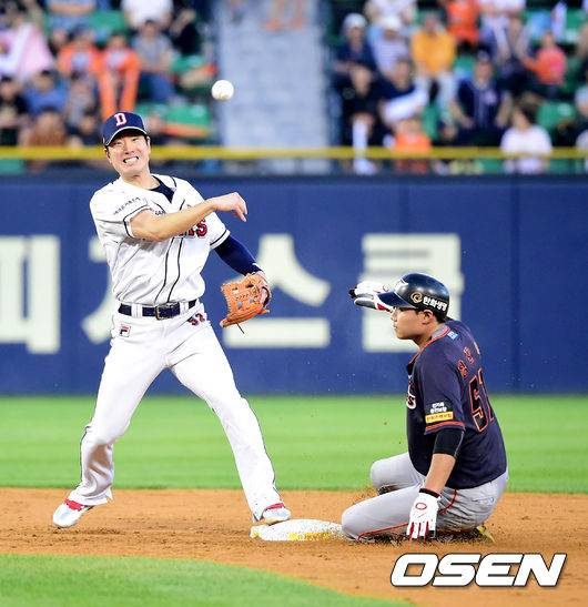 4회초 1사 1루에서 두산 김재호가 한화 이성열의 2루땅볼에 장진혁을 포스아웃하고 1루로 송구하고 있다. /jpnews@osen.co.kr