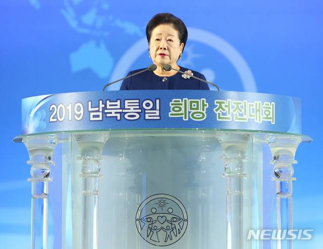 【강릉=뉴시스】 김경목 기자 = 한학자 세계평화통일가정연합 총재가 29일 오후 강원 강릉시 강릉 스피드스케이팅 경기장에서 열린 '2019 남북통일 희망 전진대회'에서 기조연설을 하고 있다.
