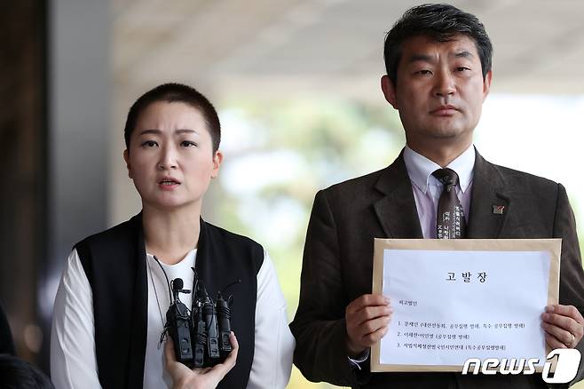 이들은 이날 고발장 제출에 앞서 기자회견을 통해 "지난 27일 문재인 대통령의 검찰개혁 메시지는 집회 참가 독려이기 때문에 문 대통령을 내란선동죄로 고발한다"고 밝히고, 지난 28일 개최된 '검찰개혁 촛불문화제'를 주도한 단체와 참여 전·현직 국회의원 및 참가자, 참여 독려한 대통령, 집권여당 대표 등 또한 특수공무집행 방해죄로 고발한다고 말했다. 2019.9.30/뉴스1