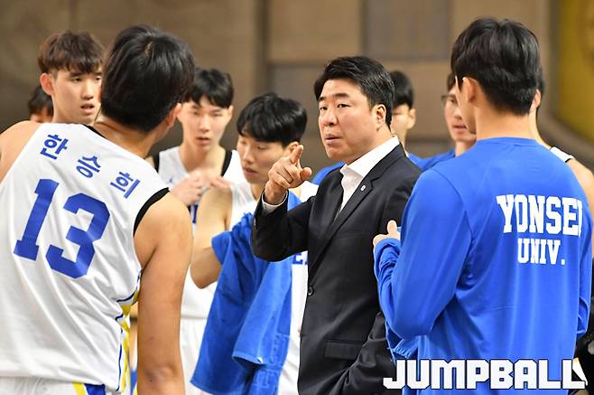 [점프볼=천안/홍기웅 기자] 30일 상명대학교 천안캠퍼스 체육관에서 열린 '2019 KUSF 대학농구 U-리그' 상명대와 연세대의 경기. 연세대 은희석 감독이 작전을 지시하고 있다. 2019-09-30 홍기웅(woong_sport@naver.com)