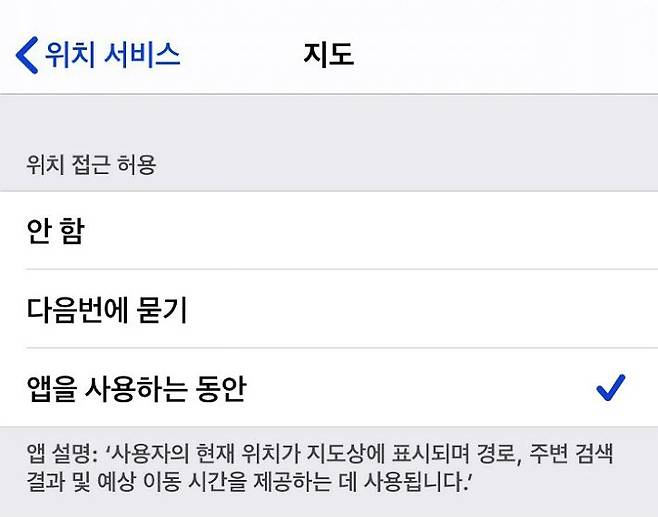4) 사용자가 원하는대로 '안 함' / '다음번에 묻기' / '앱을 사용하는 동안' 중 수동 선택이 가능하다.
