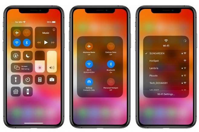 애플은 설정 대신 제어센터의 Wi-Fi 아이콘을 길게 눌러 자신이 바꾸려는 Wi-Fi를 쉽게 선택할 수 있도록 했다. 블루투스 연결도 같은 방식으로 쉽게 바꿀 수 있다.
