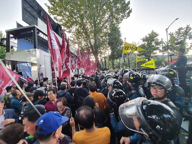 ![3일 오후 7시30분께 청와대 앞 사랑채에서 범보수 시위대가 바리케이드를 무너뜨리고 있다. 시위대는 경찰의 방패를 빼앗기도 했으며 경찰을 시위대 사이로 끌어내 자칫 경찰이 폭행 당활 위기에 처하기도 했다. 시위대 중 일부는 이날 오후 3시20분께 각목을 휘두르면서 경찰 저지라인을 뚫으려다 35명이 경찰에 연행되기도 했다. [사진=김민지 기자]](https://img3.daumcdn.net/thumb/R658x0.q70/?fname=https://t1.daumcdn.net/news/201910/03/ned/20191003201707294okfr.jpg)