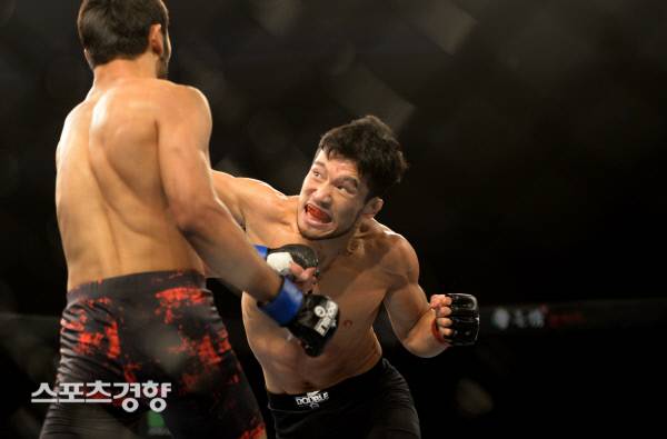 홍준영(30·코리안좀비MMA)이 5일 서울 더케이호텔에서 열린 ‘더블지FC 03’에서 상대로 나선 아지즈백 오소르백(24·키르기스스탄)의 안면부에 강력한 펀치를 적중시키고 있다.