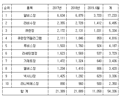 [표] 청구 상위 10개 라니티딘 성분 전문의약품(2017~2019.6) (단위 : 천 건)