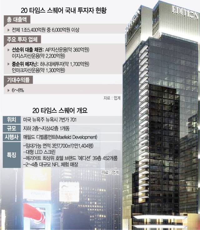 20타임스스퀘어는 해외 대체투자 업계에서 핵심투자 자산으로 평가받았다. 뉴욕 중심부에 위치하고 연 유동인구만 1억3,000만명에 상업 시설에 대규모 NFL 체험시설과 세계에서 4곳밖에 없다는 메리어트 에디션 등도 들어설 예정이었다. 환헤지 비용을 감안하더라도 선순위 대출자는 연간 5~6% 이상, 중순위 대출은 최고 8%대의 안정적인 수익률을 확보할 수 있는 점이 가장 큰 매력이었다. 부동산 투자업계의 한 관계자는 “투자에 모든 변수를 고려하기는 힘들지만 최고 코어 자산 투자에도 문제가 생겨 휴유증은 상당할 것”이라며 “앞서 증권사 한 곳은 투자를 철회하는 등 선제적 대응에 나섰다는 점에서 다른 투자자들은 문제가 될 수 있다”고 말했다. /강도원기자 theone@sedaily.com