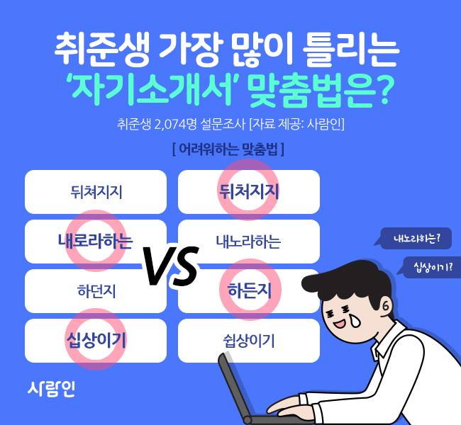 임민욱 사람인 팀장은 “자소서의 맞춤법 실수는 지원자가 꼼꼼하지 않거나 프로페셔널하지 못하다는 인상을 줘 주의가 필요하다”며 “본인이 틀린지 알지 못하는 경우도 많아 글을 완성한 다음에는 ‘사람인 맞춤법 검사기’ 등 맞춤법 검사 툴을 활용해 점검하고 고쳐나가도록 노력해야 한다”고 말했다.