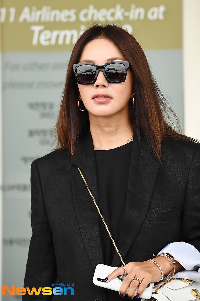 배우 엄정화가 공항패션을 선보이며 프랑스 파리로 출국하고 있다.