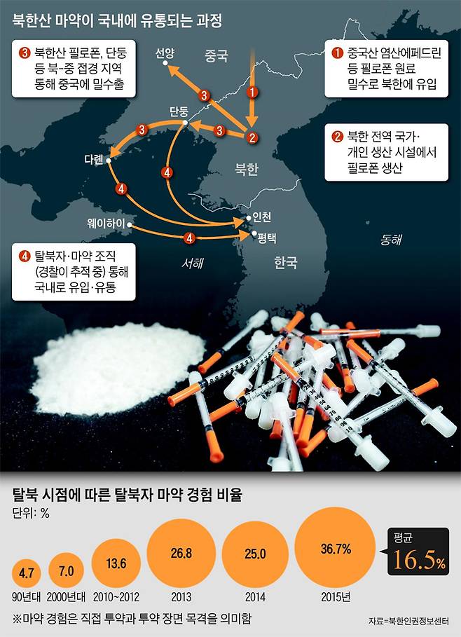 북한산 필로폰은 원재료 단계에서부터 중국→북한→중국→한국의 경로를 밟아 국내에 유입되는 것으로 정보 당국은 파악한다. 북한은 필로폰의 원료가 되는 염산에페드린을 중국에서 밀수해, 이를 평양·흥남 등 곳곳에 설치된 국가·개인 생산 시설에서 필로폰으로 만든다. 생산된 필로폰은 북·중 접경 지역인 단둥 등을 통해 다시 선양·다롄·칭다오·웨이하이 등으로 퍼져 나간다. 단둥·다롄에서는 선박을 통해 인천항으로, 웨이하이에서 출발한 선박은 평택항으로 들어오는 구조다. 경찰 관계자는 "마약 유통책들은 전과(前科)가 없는 보따리상 등을 활용해 필로폰 등을 밀반입하는 경우가 많다"고 했다.