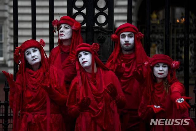 【런던= AP/뉴시스】영국 런던의 버킹검 궁전 앞에서 기후변화에 대한 신속대응을 촉구하는 '멸종저항' 시위대원들이 7일(현지시간) 철문 앞에서 포즈를 취하고 있다. 이 날 300명 가까운 사람이 체포되었다고 런던 경찰은 밝혔다. 2019.10.08