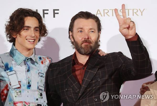 (부산=연합뉴스) 이재희 기자 = '제24회 부산국제영화제' 엿새째인 8일 오후 부산 해운대구 영화의전당 야외무대에서 열리는 '더 킹: 헨리 5세' 상영에 앞서 배우 티모테 샬라메(왼쪽), 조엘 에저튼이 포즈를 취하고 있다. 2019.10.8