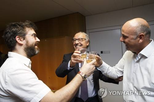 epa07905949 David Ehrenreich (L), Astrophysicist at the Geneva Observatory, Yves Flueckiger (C), Rector of the University of Geneva, and Astrophysicist Francesco Pepe, director of the Geneva Observatory, celebrate with sparkling wine following the Nobel Prize awarded to Swiss astrophysicist Michel Mayor and Swiss astrophysicist Didier Queloz from the university of Geneva, during a press conference, at the university of Geneva, in Geneva, Switzerland, 08 October 2019. The Nobel Prize in Physics has been today jointly awarded to James Peebles, Michel Mayor and Didier Queloz. One half of the prize was awarded to Peebles for 'theoretical discoveries in physical cosmology,' and the other half to Mayor and Queloz for 'the discovery of an exoplanet orbiting a solar-type star.'. (KEYSTONE/Salvatore Di Nolfi) EPA/SALVATORE DI NOLFI