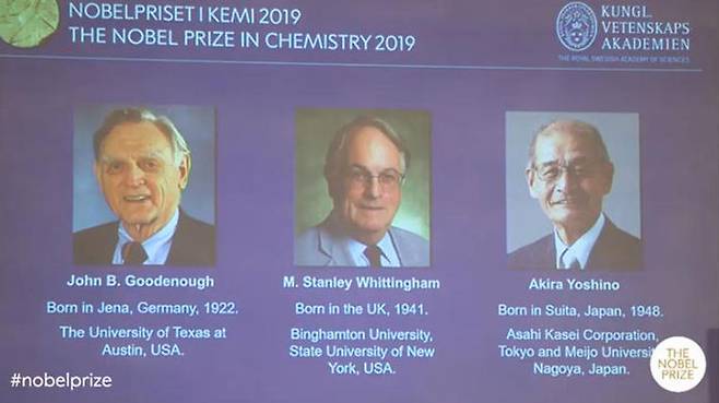 스웨덴 왕립과학원 노벨위원회는 리튬 이온 배터리의 발전에 기여한 공로를 인정해 ▲존 굿이너프 미국 텍사스대 교수▲스탠리 위팅엄 미국 빙햄턴대 교수 ▲요시노 아키라 일본 메이조대 교수 등 3명의 화학자를 2019 노벨화학상 수상자로 선정했다고 9일 밝혔습니다.